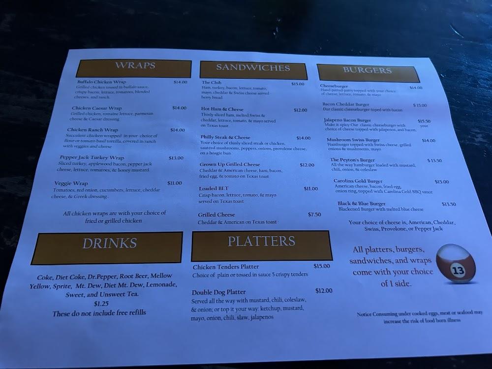 The menu at Peyton's Place caters to diverse tastes. Expect classic bar fare, including burgers, sandwiches, and kid-friendly options. Popular items include the Inferno Fiery Burger and the Chicken Ranch Wrap, satisfying hungry diners.